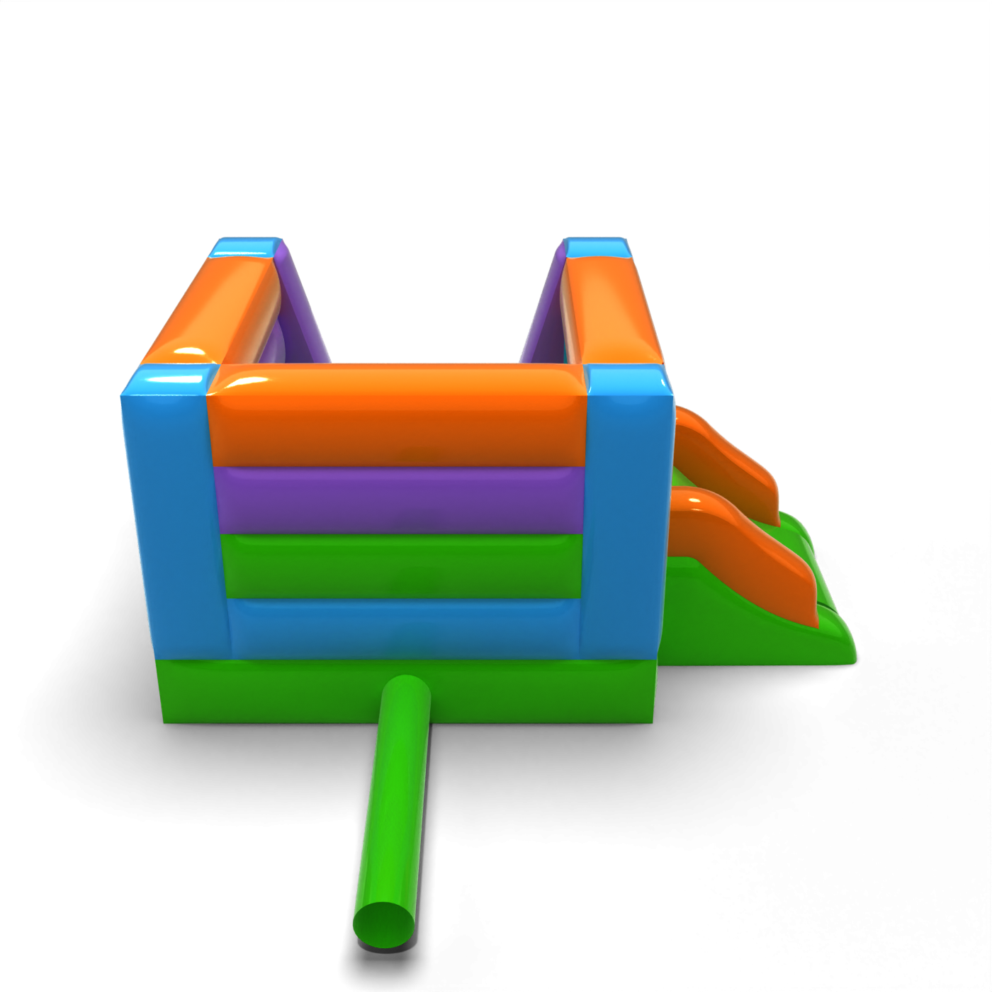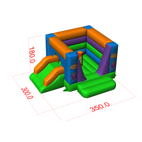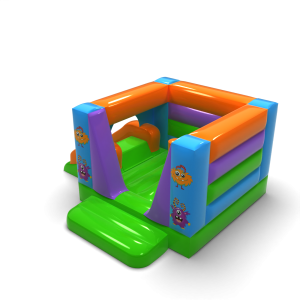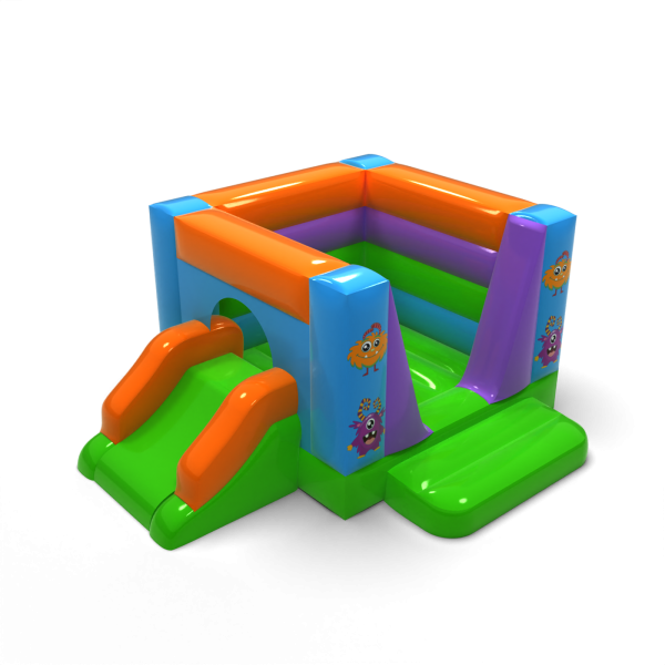Die Version mit Rutsche bietet eine Extraportion Spaß für Kinder - zusätzlich zur Sprungfläche können sich die Kleinen auf einer kurzen, bunten Rutsche vergnügen. Die lächelnden Monstermotive verleihen der Struktur einen freundlichen Charakter, und dank ihrer geringen Größe lässt sie sich sowohl im Freien als auch innerhalb der HoReCa-Einrichtungen leicht aufstellen. Es ist eine vielseitige Attraktion, die das Animationsangebot für Kinder bereichert.