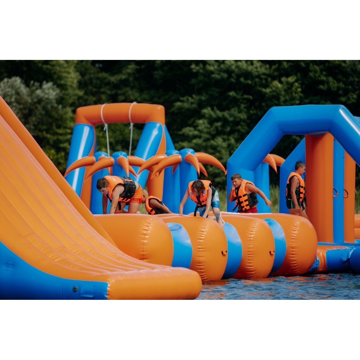 Der Aufblasbarer Wasserpark Mi (28 x 17 m) garantiert unvergessliche Emotionen an langen Sommertagen. Diese Produkte sind ein absoluter Hit für alle Altersgruppen, von den Jüngsten bis hin zu den erwachsenen Liebhabern des Wassersports. Aufblasbare Wasserparks können mit zusätzlichen Rutschen erweitert werden. Ein Urlaub am Wasser kann auf einem aufblasbaren Wasserpark zu einer Reihe großer Abenteuer und Verfolgungsjagden werden. Testen Sie sich auf Hindernisbahnen, springen Sie über einen Affenhügel und schweben Sie knapp über der Wasseroberfläche. Springen Sie von einem großen aufblasbaren Kissen ab. Der aufblasbare Wasserpark ist ideal, um den Raum eines Gewässers zu erschließen. Der aufblasbare Wasserpark ist zudem vollständig mobil, zusammenlegbar und transportabel. So können Sie Ihren aufblasbaren Wasserpark mit jeder neuen Saison erweitern. Warum sollten Sie in einen aufblasbaren Wasserpark für Kinder und Erwachsene investieren? Mit einer solchen Attraktion kommen Sie den Bedürfnissen der Kunden entgegen, die an heißen Tagen nach einer Abkühlung dürsten. Mit mehrdimensionalen Hindernissen können Sie eine Attraktion schaffen, die Kunden anzieht, wobei ihre Komplexität Langeweile von vornherein ausschließt. Organisieren Sie Wettkämpfe für Neulinge und für Fortgeschrittene. Aufblasbare Wasserparks ermöglichen es Ihnen, Kinder in einer sicheren Umgebung für lange Zeit zu beschäftigen. So können sich Eltern und Betreuer direkt neben dem aufblasbaren Wasserpark einen Moment der Entspannung gönnen.