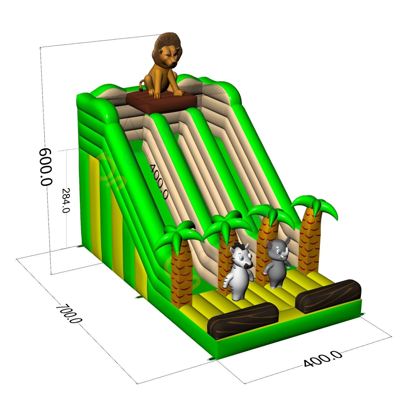 Eine doppelte aufblasbare Rutsche mit einem Dschungelthema ermöglicht es, mehr Teilnehmer zu versorgen und erhöht die Attraktivität des Spielbereichs. Die Hüpfburg wurde unter normalen Veranstaltungsbedingungen genutzt. Der Zustand der Attraktion ist gut, mit normalen Gebrauchsspuren wie auf den Fotos zu sehen. Das Produkt eignet sich für eine weitere kommerzielle Nutzung als vollwertige Veranstaltungsattraktion. Für weitere Informationen, Fotos und Filmmaterial zu dem Produkt kontaktieren Sie uns bitte.