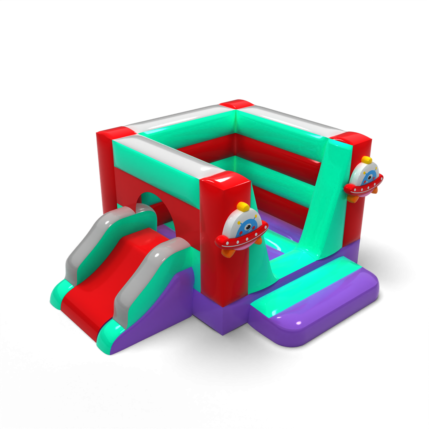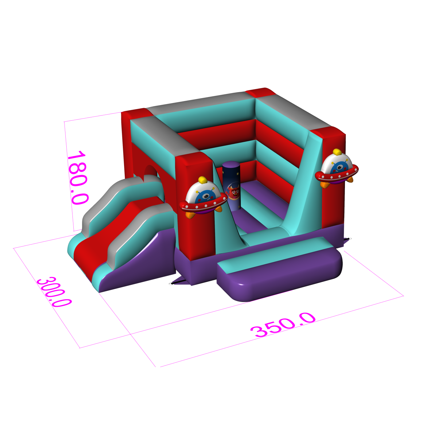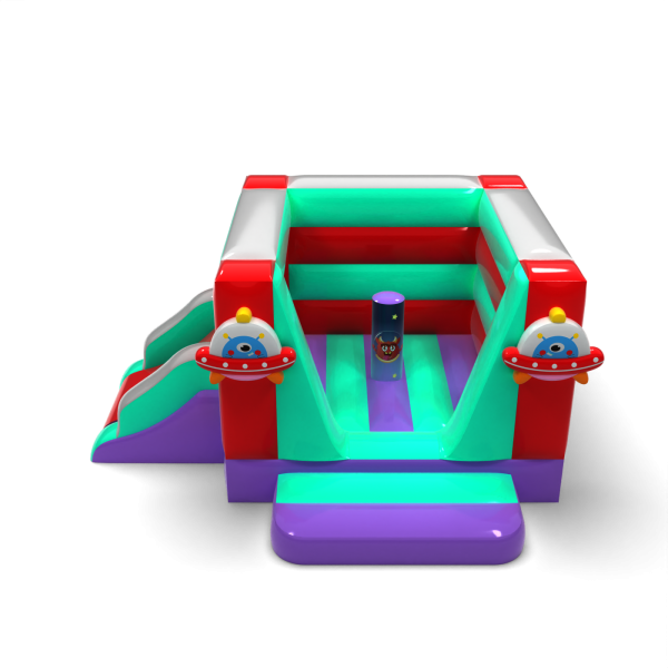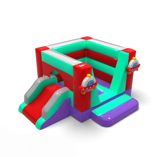 Die Space Bouncer-Version mit Rutsche ist eine zusätzliche Attraktion, die die Spielzeit verlängert und die körperliche Aktivität fördert. Die farbenfrohen Elemente und die Motive der fliegenden Untertasse schaffen eine einladende Atmosphäre, und dank der kompakten Größe kann sie sowohl im Freien als auch in Innenräumen aufgestellt werden. Eine praktische Lösung für die HoReCa-Branche und Veranstalter, die Kindern einen attraktiven und sicheren Spielraum bieten wollen. Sorgen Sie für einen modernen Blickpunkt, der sich leicht an verschiedene Veranstaltungsszenarien anpassen lässt.