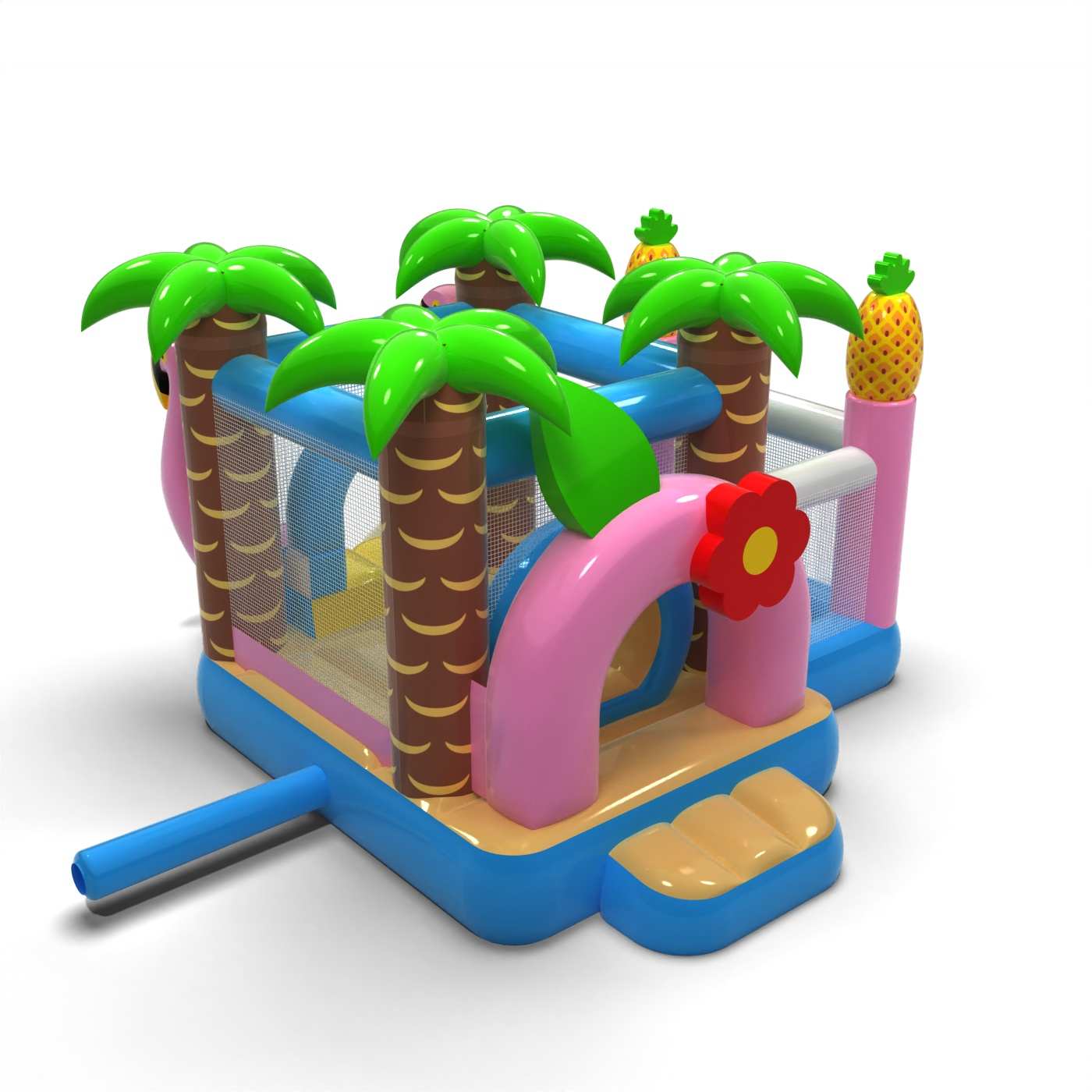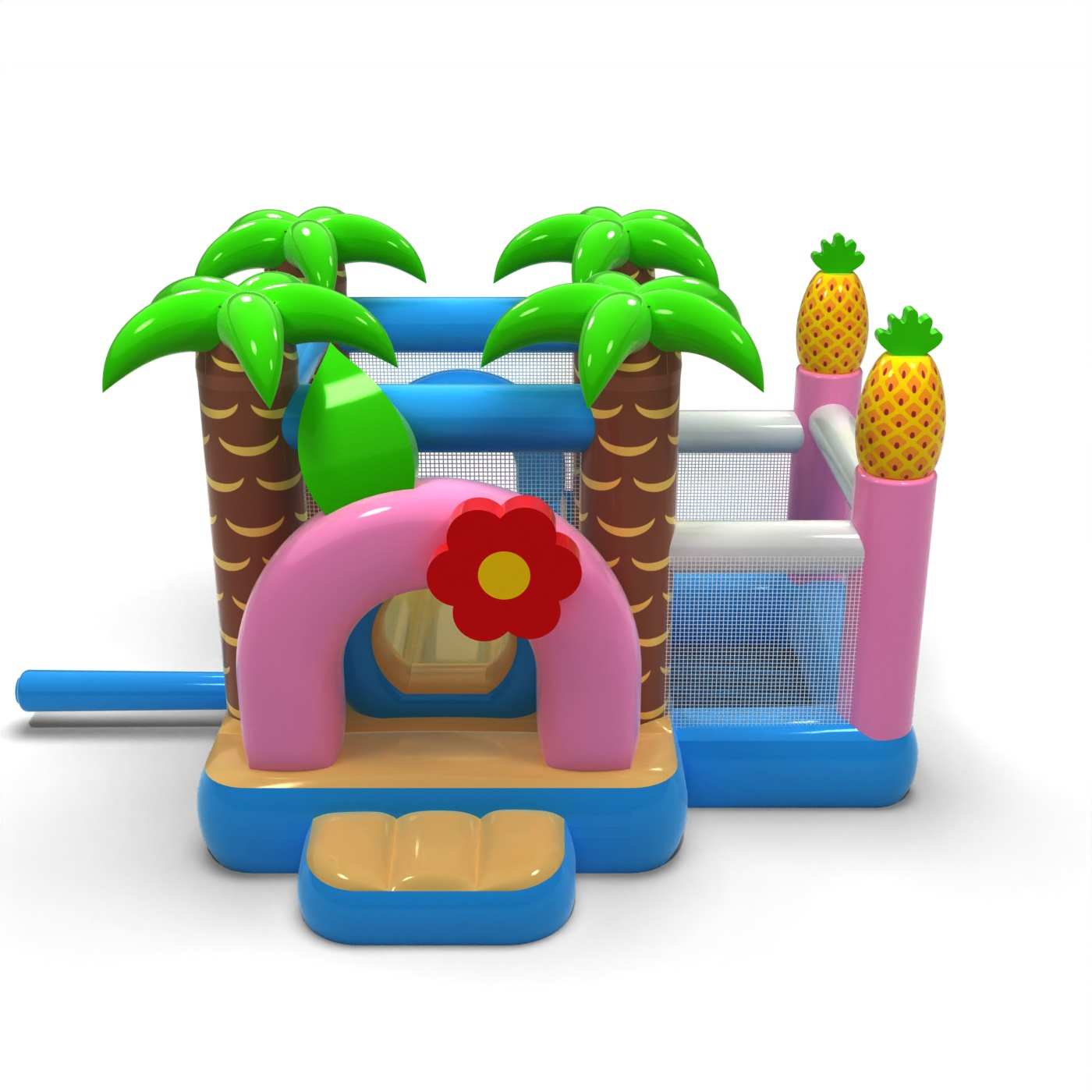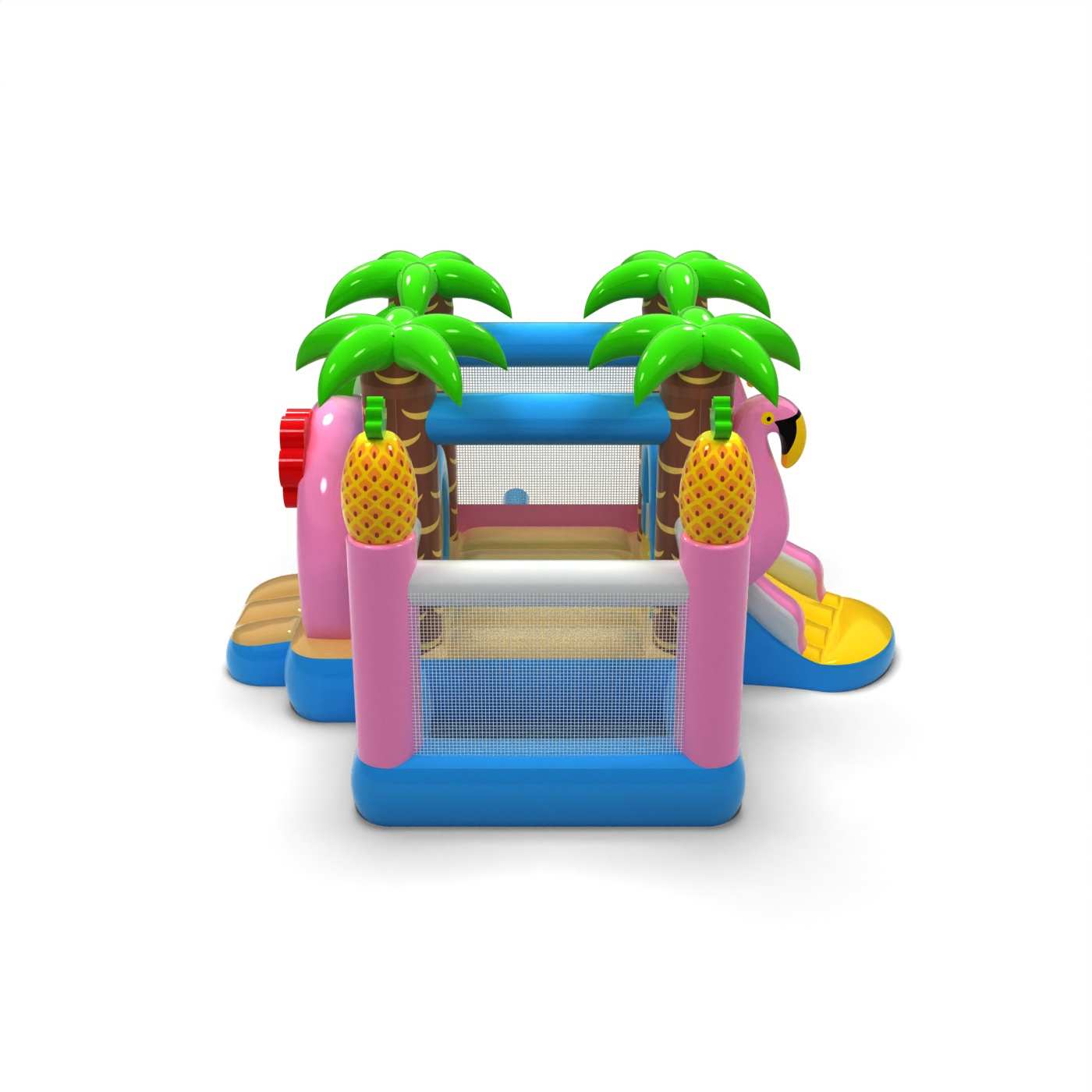 Das von tropischen Ferien inspirierte Design schafft einen fröhlichen und freundlichen Spielraum für die Kleinsten. Die Kombination aus einer Hüpfzone und einem Trockenbecken ermöglicht es den Kleinen, sich frei zu bewegen und die Attraktionen sicher zu genießen. Die sommerliche Optik weckt positive Emotionen und passt gut zum Open-Air-Charakter der Veranstaltungen. Durch das kompakte Format lässt sich die Hüpfburg auch in einem kleineren Animationsbereich leicht organisieren. Die Attraktion ist ideal für Familienpicknicks, Festivals und Sommerveranstaltungen im Freien.